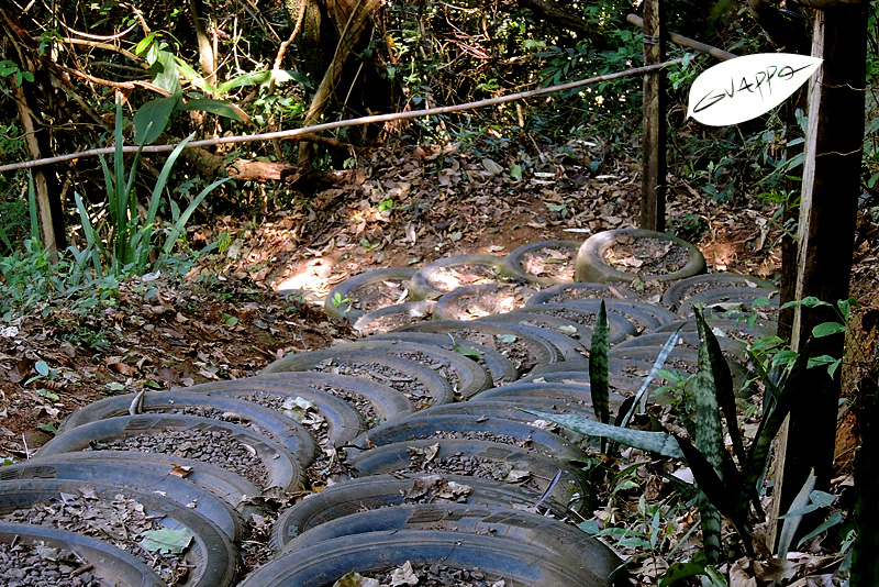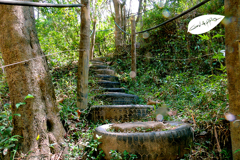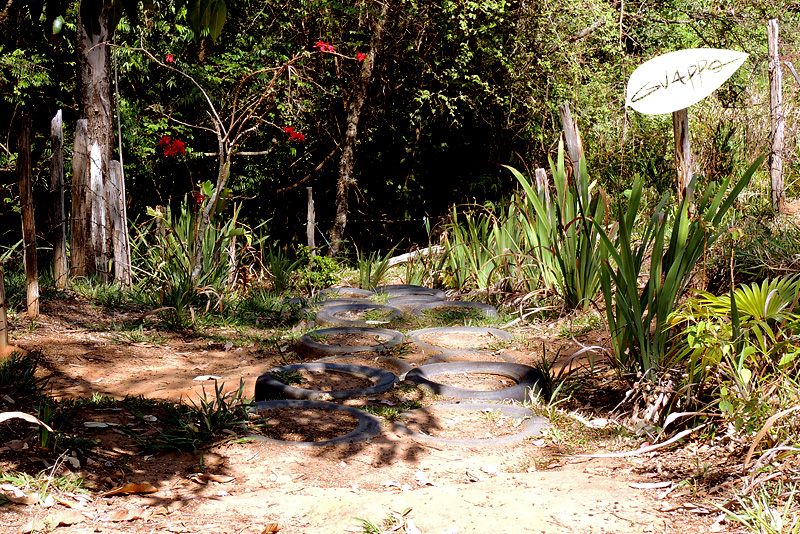 Seguimos para o começo trilha e a primeira surpresa.  “Uma escada de Pneus”  Sim, isso mesmo, uma escada ecológica feita com 608 pneus usados que foram reutilizados de forma muito criativa para dar mais segurança na descida da trilha até a cachoeira.